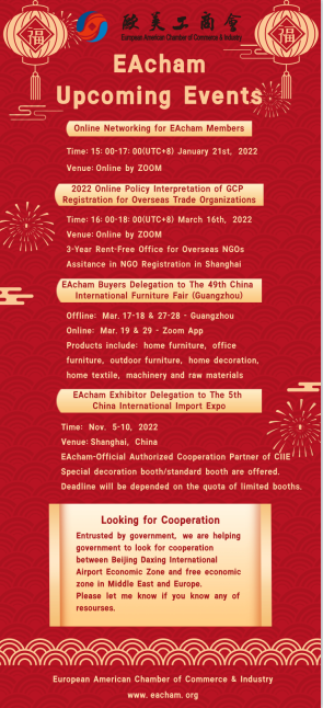 Kindly find EAcham's latest upcoming events for your kind information. You may find below links for more details. If you are interested in, please don't hesitate to contact us. Thank you.