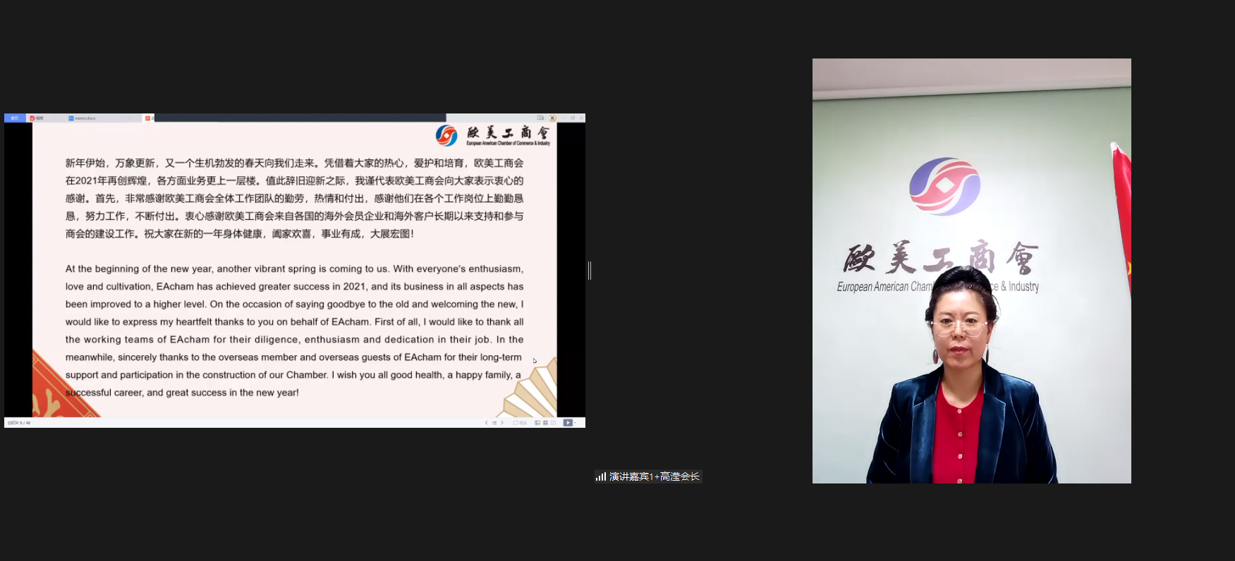 At the beginning of the meeting, Gao Ying, chairwoman of EAcham, first gave a New Year's speech, reviewing 2021 and looking forward to 2022.