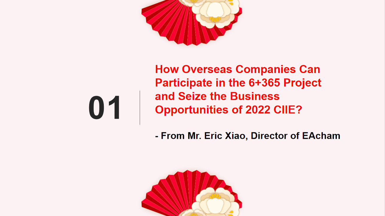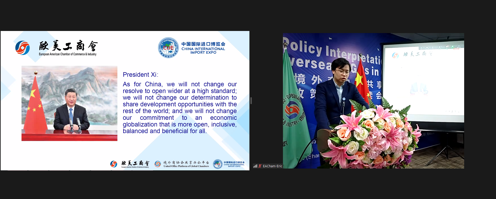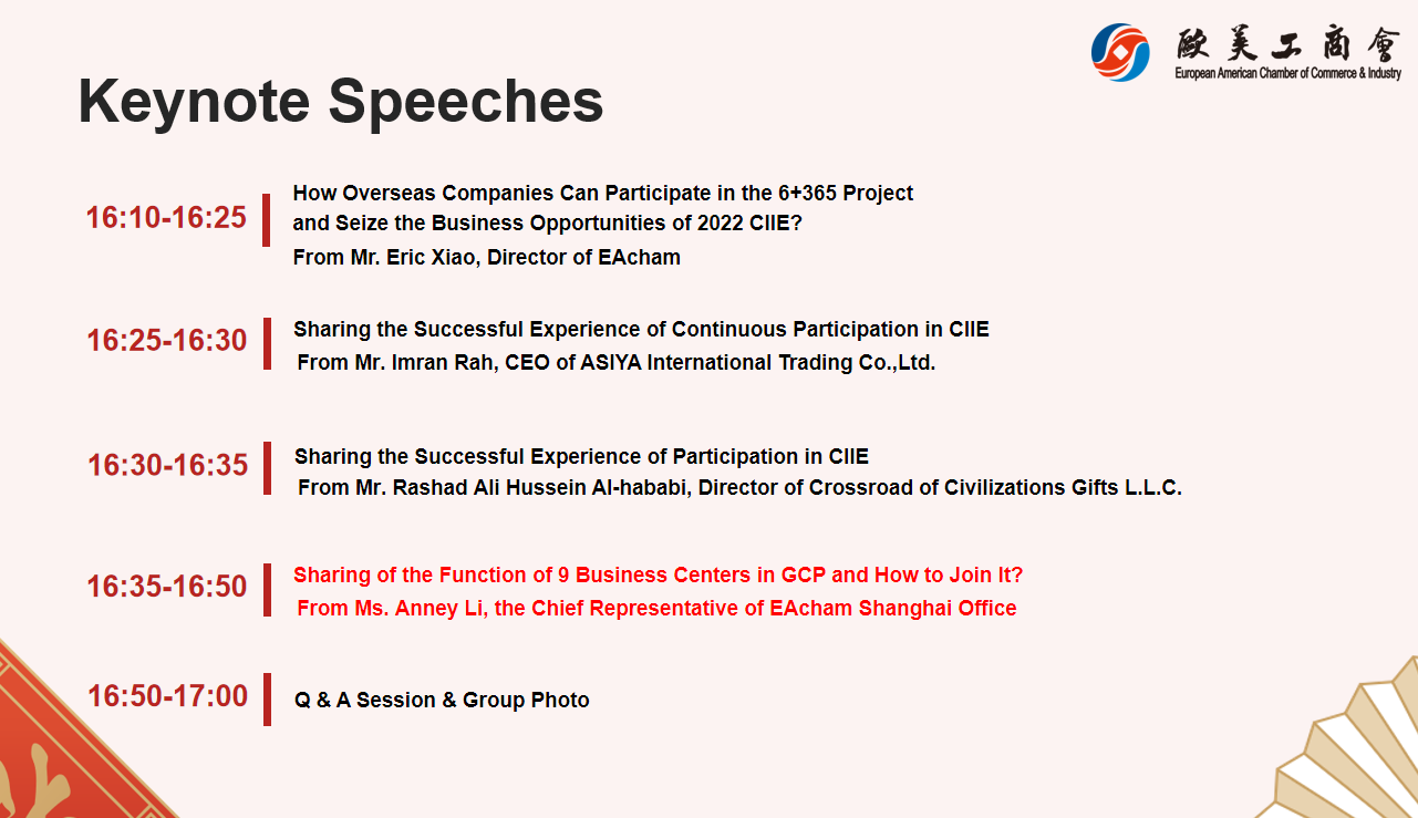 Firstly, Mr. Eric Xiao, Director of EAcham made a speech about How Overseas Companies Can Participate in the 6+365 Project and Seize the Business Opportunities of 2022 CIIE?
